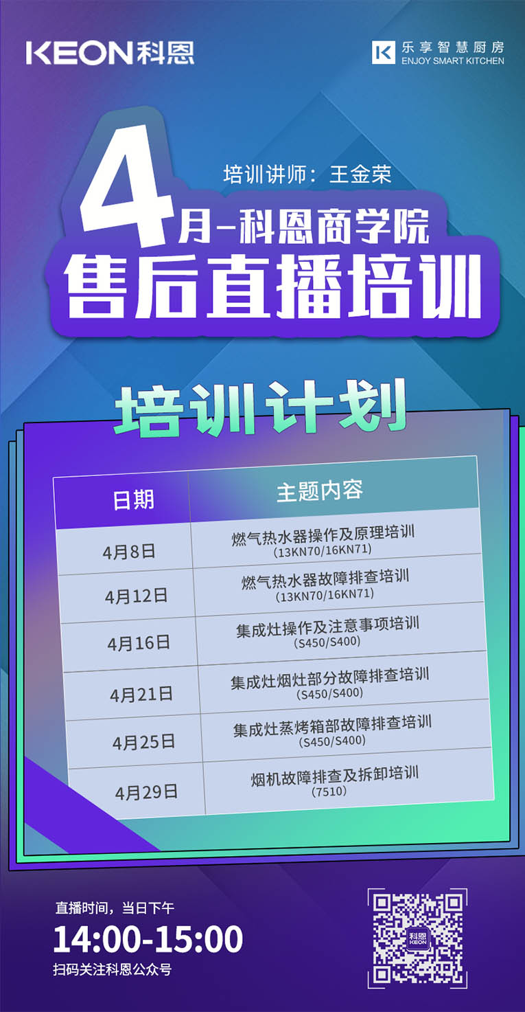 勤修內功,強化技能,提升自我!集成灶十大品牌、廚電行業十大品牌科恩集成灶4月線上直播培訓總覽,儲備知識,保障團隊凝聚力和戰力力,上下齊心,打造黃金團隊,擴大品牌影響力!